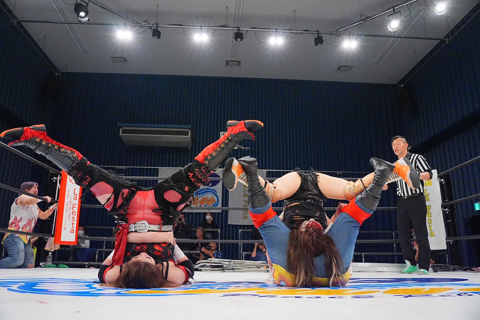 今度はブレーンバスター狙いに行くが、SAKIがカット。しのせがドロップキックからSAKIのアトミックドロップキック。続けてしのせがネックブリーカードロップ。