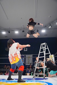 今度は世羅がリング上にラダーを設置。炎華が上り始めると、宮崎が反対から上り始めて阻止に出ようとする。炎華がメガホンで一撃。これを宮崎が奪うと、逆にメガホンで殴打する。世羅が背後から宮崎を抱え上げると投げ捨て式のパワーボム。ここで炎華がラダー上からダイビングボディアタック。2カウント。今度はトップロープへ上る。