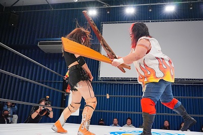 炎華が笹村へ片ヒザをついたまま、反撃のエルボーで殴り掛かる。笹村もエルボーで打ち返す。笹村がイスを振り上げると、炎華がドロップキックで阻止。しかし、タッチに行こうとするが、笹村が足を引っ張っていかせず。それでもメガホンを笹村へ打ち、ついに凶器攻撃で一撃すると、ようやく自軍のコーナーへ。世羅とすずが登場。すずがダブルのスピアーでみぃ、笹村を蹴散らす。