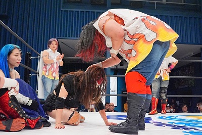 続いて、咲蘭を呼び込んでトレイン攻撃。さらに桜花が咲蘭を持ち上げて、補助付きのフットスタンプ。続けて、咲蘭がしのせの手を踏みつける。低空ドロップキックを打ち込むと、しのせはエプロンへ逃げる。咲蘭が追いかけると、エプロンで手を踏みつけ、ヒップドロップで尻もちを付く。