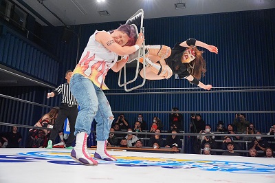 炎華が2カウントで返すと「炎華」コール。みぃがイスを積み上げると、その上にブレーンバスター。しかし、投げたみぃもイスにぶつかってダメ―ジを食らう。それでもフォールに行き、2カウント。