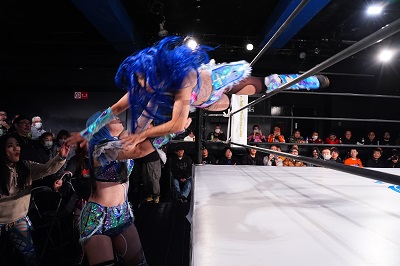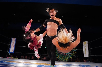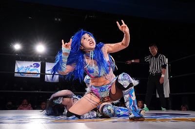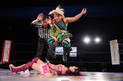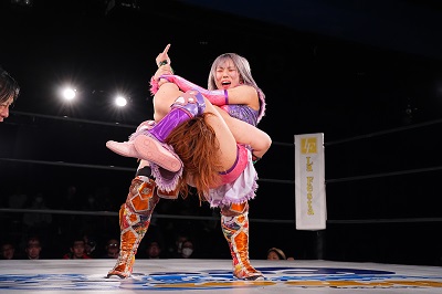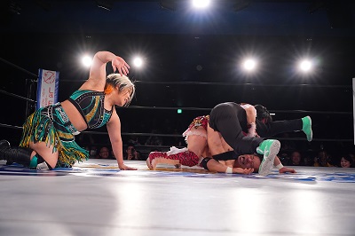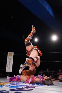 続いてミクがヘアホイップから、サーフボードに取る。ボディスラム。逆さ抑え込みを切り返した炎華が低空ドロップキック。