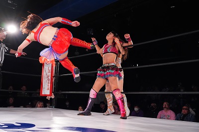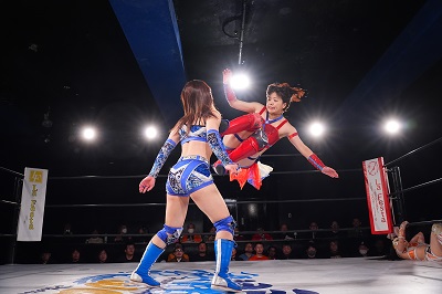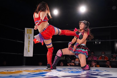 咲蘭はトレイン攻撃をかわして串刺しドロップキック。続いて、桜花は「オーッ!」からの背面タックル。