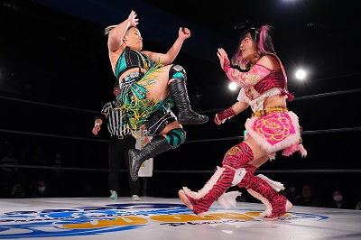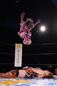 美蘭がロープへ逃れると、ミリアが二段蹴り。ミリアから炎華にタッチ。炎華がコーナーに振り、側転エルボーを狙ったが、足で回避されて失敗。それでも至近距離からのドロップキックを放つと今度こそ側転エルボーに成功。