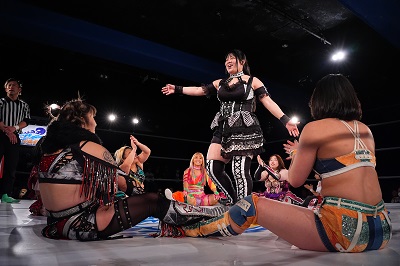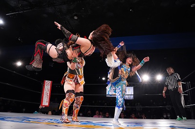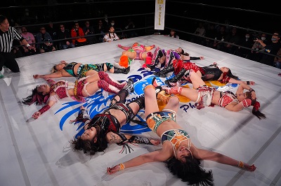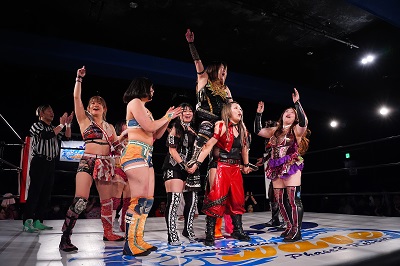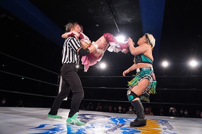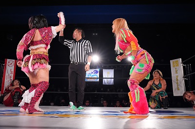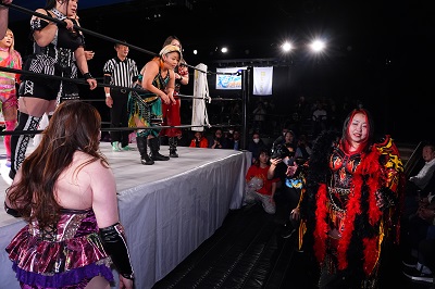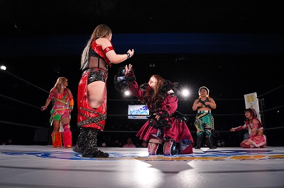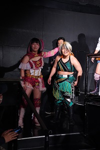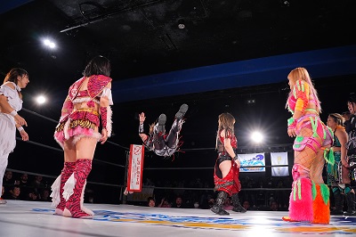 梅咲とななみがダブルのドロップキックでSAKI、YuuRIを場外へ落とす。さらに梅咲がコルバタでななみを場外へ。3人はセカンドロープから場外へ落ちているため、オーバー・ザ・トップロープは適用されず。