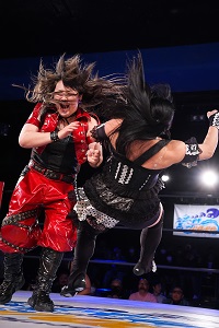 ック。続いて美蘭もドロップキックから619。2カウント。フィッシャーマンを狙うが、これを回避したミリアがDDT。さらに正面と背後へのローキックをぶち込む。