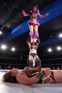 今度は桜花&咲蘭が合体式のドロップキックから、同じく合体式フットスタンプ。桜花は「ベルト防衛するぞ、オーッ!」とアピールから咲蘭を抱え上げ式のボディプレス。