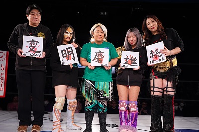 二上会長「ではオオトリ行かせていただきます。私の一文字は『変』。変化、変更、変革、変な変、いろいろあると思います。昨日で宮崎が引退して、見てください。保護者二人と子供3人みたいな。この絵面見てください。18年前、二人で立ち上げて、子供が3人できたみたいな。(咲蘭と)40歳差があります。私が二十歳で産んで、その次が二十歳で産んでいたらもう孫です。そんなwaveですが、私の中で今日からが変化ではなく、世羅の引退後にフェーズ3がやってくるような気がしています。どんどん若い世代にシフトチェンジしていこうかなと思いますので、これからもみなさん、続けて見に来ていただけたら。コミカルは変わらずやります。ウチからコミカルを取ると何も残らないので。もう一つ、個人的には変態の変でもあります。プロレス頭をもっともっと変態にしていくので、これからも見続けていただけたらと思います」
