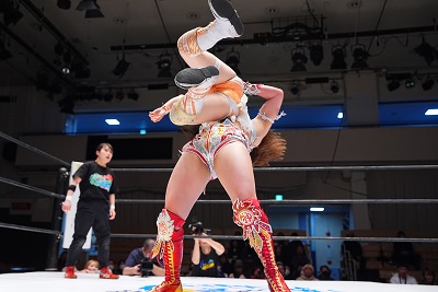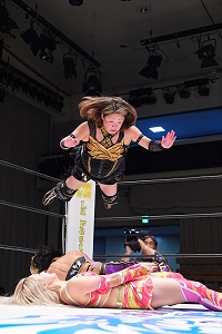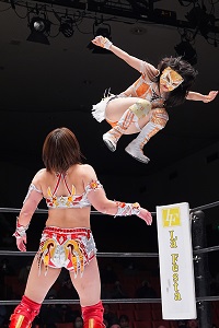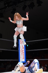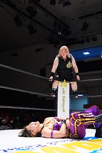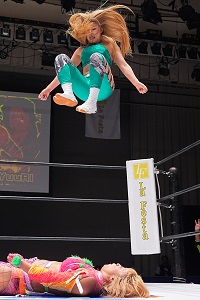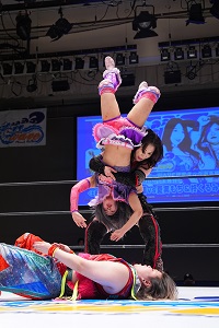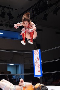さらに咲蘭を呼び込んでトレイン攻撃。合体式フットスタンプで咲蘭を抱え落とす。2カウント。