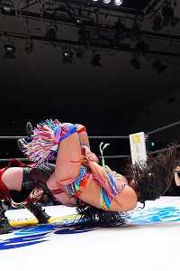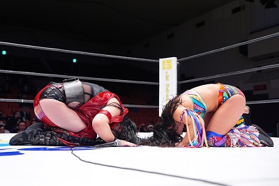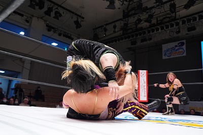 咲蘭がエルボーの反撃。くるみは「どうした、もっと来いよ」と挑発。咲蘭が吠えてエルボーを打ち込む。くるみがコーナーに振ると、咲蘭がブーメランアタックで跳ね返る。くるみがキャッチするも、桜花が咲蘭の背中を蹴ってフォールとなったが、2カウント。