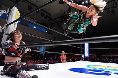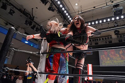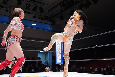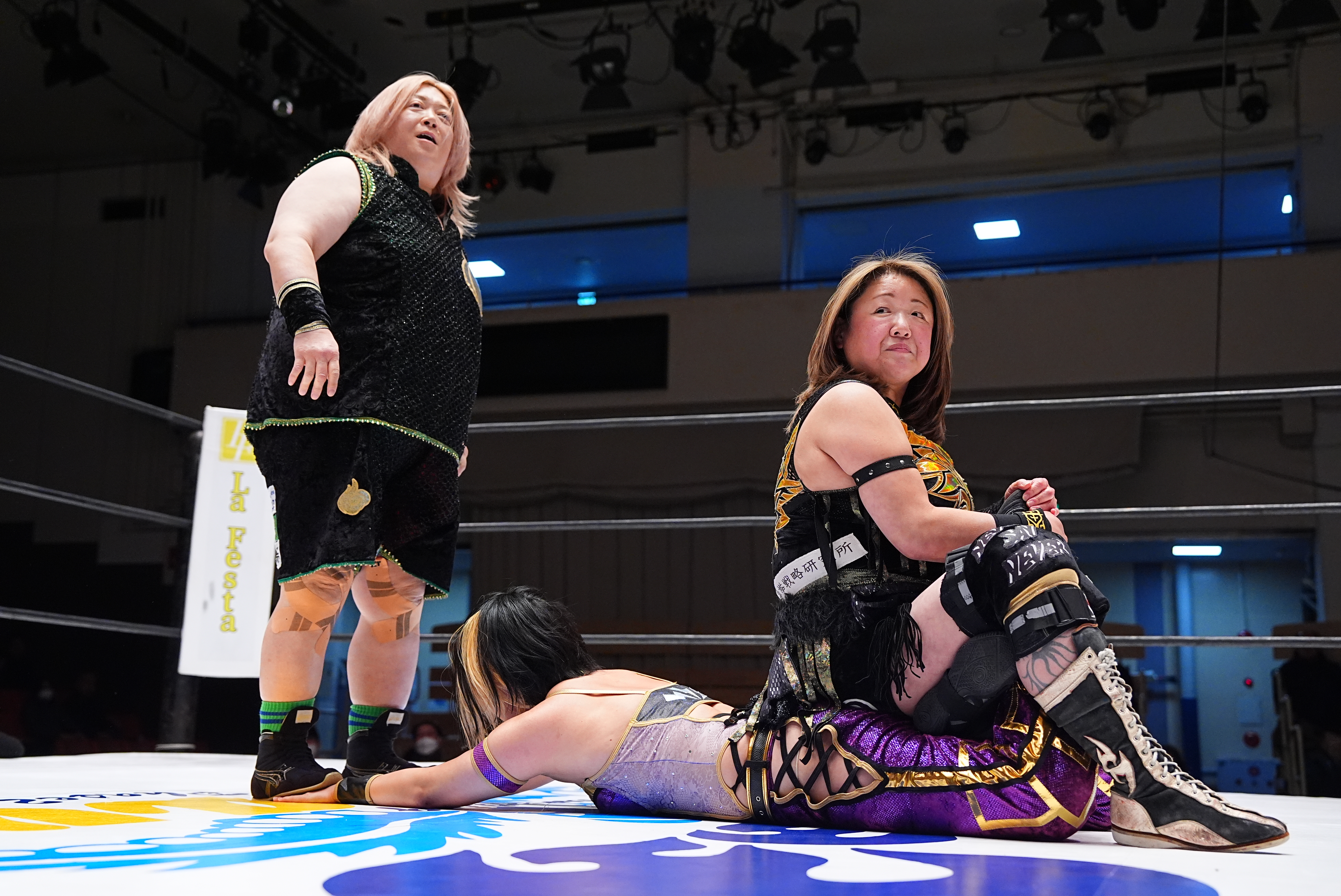 《挑戦者組》⚪夏実もち&柊くるみ(21分42秒、体固め)桜花由美⚫&咲蘭《王者組》