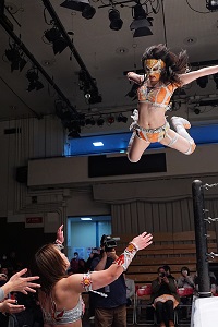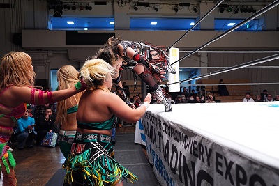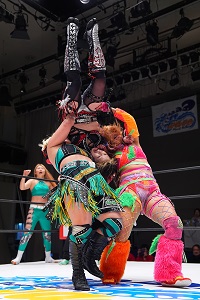 SAKIとYuuRIのクロスラインを葉月がかいくぐると、狐伯が二人めがけてミサイルキック。場外へ転落したSAKI&YuuRIへ、葉月が加速度を増していくトペで飛んだが、狐伯と同士討ち。今度はエプロンからYuuRIがトペコン。