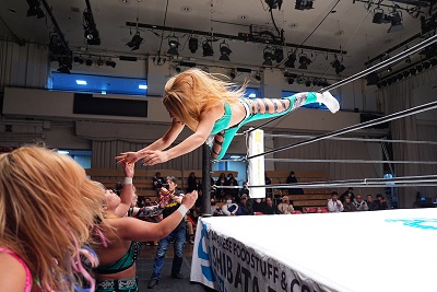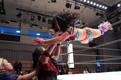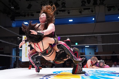 咲蘭がコーナーに上り、くるみへ背後から飛び乗るようにスリーパー。くるみにぶっこ抜きで投げられる。くるみがフットスタンプ。2カウント。
