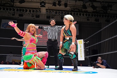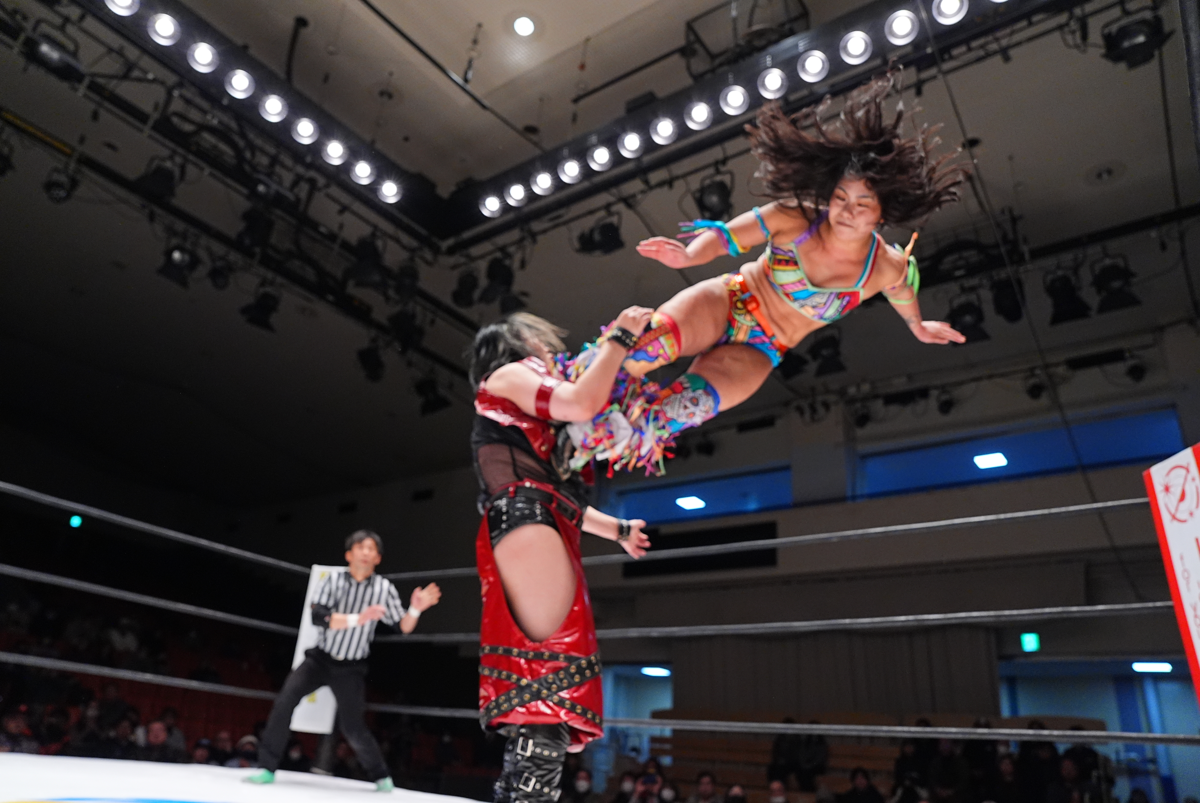 桜花がビッグブーツ、もちが裏拳の打ち合いに。もちが裏拳を連打。突進には桜花がネックハンギングボム。もちがソラリーナで丸め込むが桜花がキックアウト。もちがもっちりバディシザースはカウント2。それでも再度、もっちりバディシザースを決めるとついにカウント3が入った。