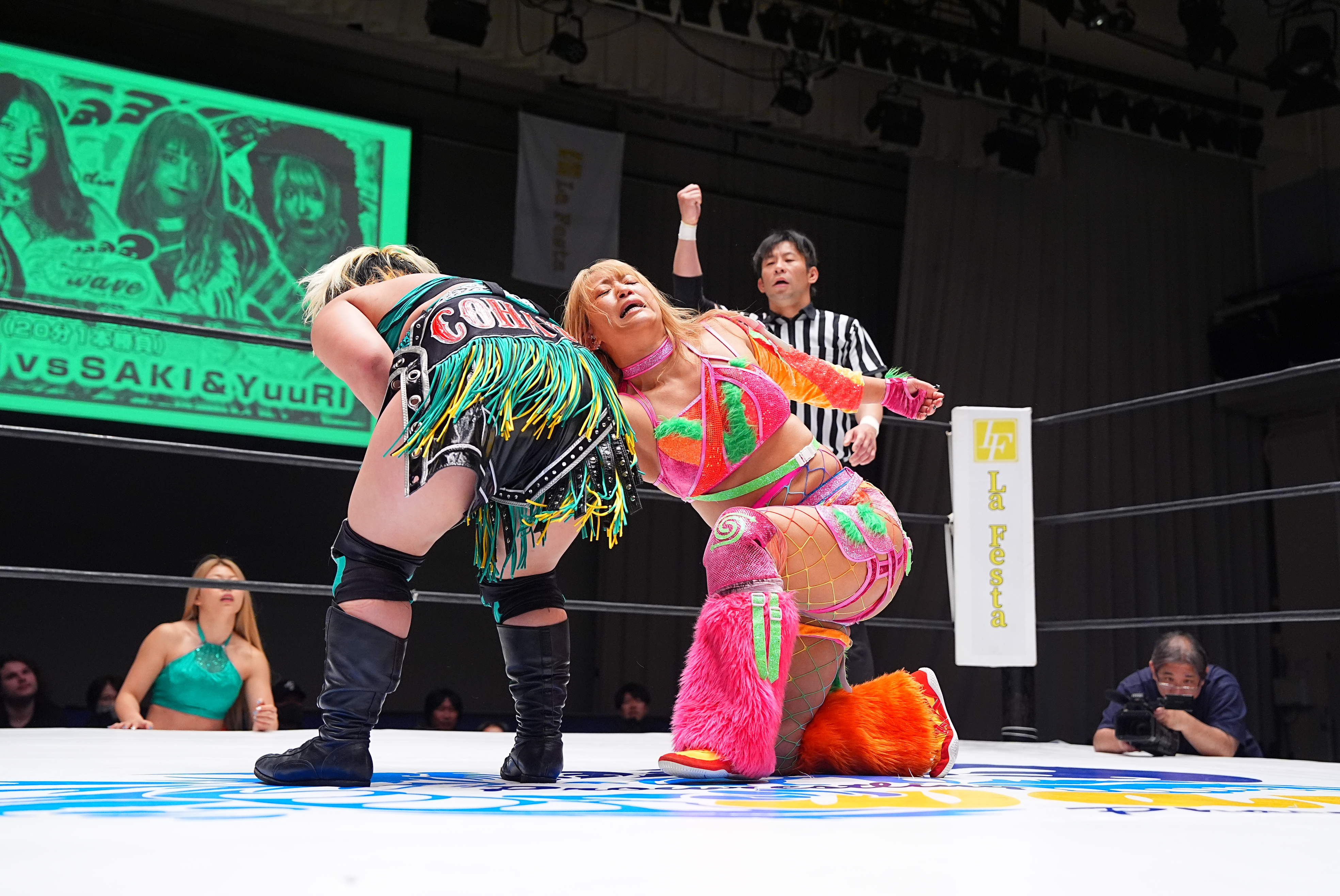 YuuRIと狐伯のブレーンバスター合戦。狐伯がこらえると、SAKIが加勢するも、なぜか、狐伯側に付いてしまい、YuuRIをダブルのブレーンバスターで投げてしまう。YuuRIが場外転落。