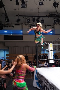 美央とChi Chiが合体技へ繰り出そうと、ロープに振るが、伊藤がフライングボディアタックで二人まとめて乗っかる。ここで渡辺が美央を中央にセットして、セカンドロープからダイビングボディプレス。立て続けに伊藤のダイビングフットスタンプが決まり3カウントとなった。