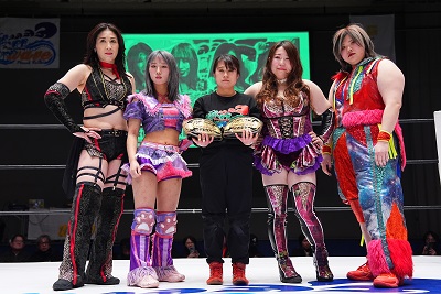 もち&くるみがダブルのバックドロップ。咲蘭のカットから桜花がもちへ投げっぱなしパワーボム。咲蘭がダイビングフットスタンプ。桜花が小鉄ドロップ。カポエラキック。ビッグブーツを狙うも、足を捕らえたもちがドラゴンスクリュー。DDT。