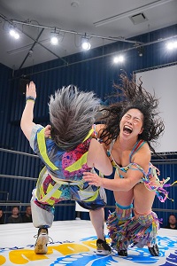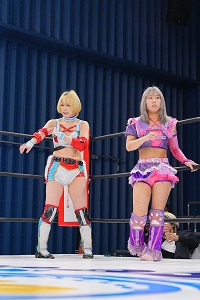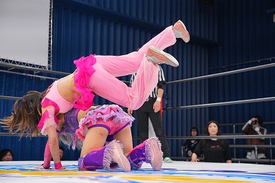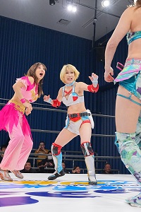 これに対して、RIKOは「じゃんけんポイ、あっち向いてホイ」からのグーパンチ。炎華がカットプレーに入るも、マゼンタがあめきゅんを分断。Mariaは梅咲にドロップキック。さらにフェースバスターで倒れている炎華の上に梅咲を乗せる。続いて、合体式のフットスタンプでMariaが梅咲と炎華の上に投下する。炎華をフォールも2カウント。