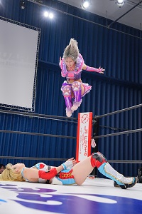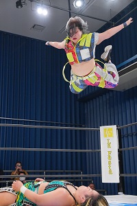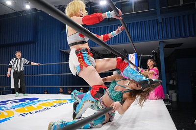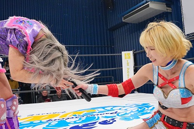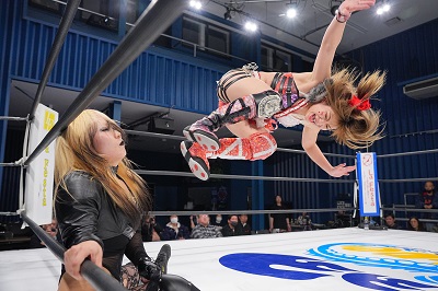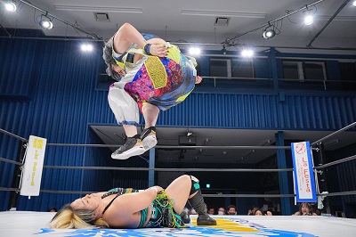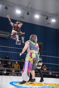 Mariaが梅咲へドロップキック。梅咲がロープにもたれると、ランニング式のカウンターキックで追い込む。ダイビングフットスタンプ。2カウント。