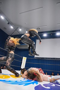 小林が突進すると、香藤がタックルで吹っ飛ばす。くるみが串刺しタックル。ミサイルキックも2カウント。