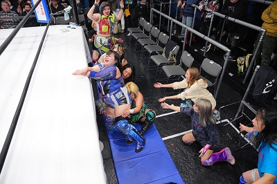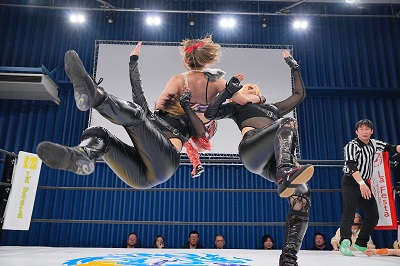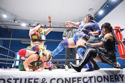炎華がティヘラで抜け出すと、ロープ二段目からMariaへ飛び乗って回転エビ固め。2カウント。代わった梅咲がドロップキック。飛び出したRIKOともどもダブルのフライングネックブリーカー。RIKOのグーパンチをエルボーで打ち返し、ブレーンバスターで投げる。