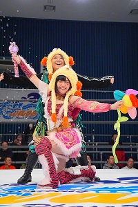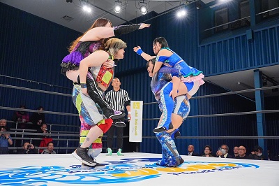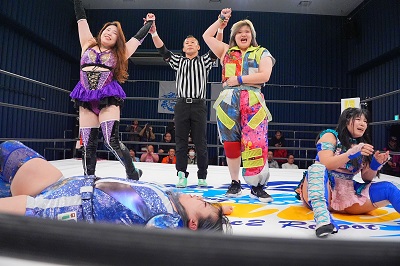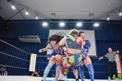 香藤にスイッチ。香藤がダイビングボディプレスを3連発、2カウント。くるみがエルボーで返し、パワーボムを狙いに行くが、妹加がカット。妹加&香藤がくるみにダブルタックル。香藤はもちを持ち上げ、くるみにボディスラムで乗せる。さらに妹加までもボディスラムも乗せていく。さらに「妹加さん、まだですよー」と強引におんぶして合体式ボディプレス。2カウント。