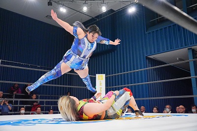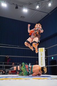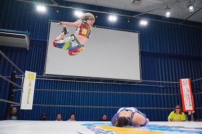 妹加がダイビングセントーンで追撃。香藤がボディプレス。2カウント。くるみがラリアットで反撃すると、続いてミサイルキックを投下。2カウント。