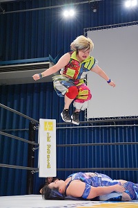 もちがセカンドロープからリバーススプラッシュでアシストした後、くるみがダイビングフットスタンプを投下する。2カウント。トドメとばかりにトップロープからダイビングボディプレス。これがダメ押しとなり、3カウントが入った。
