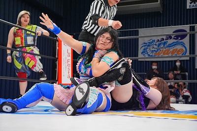 さらにフェースバスターから低空ボディアタックで追い込むが、桜花はカウント2でクリア。