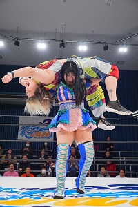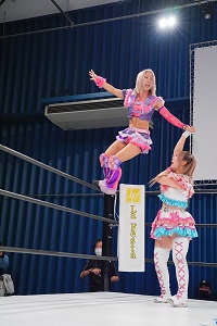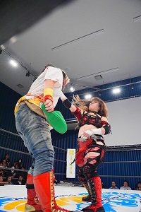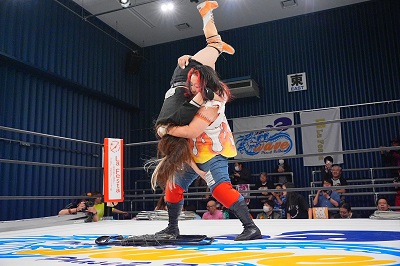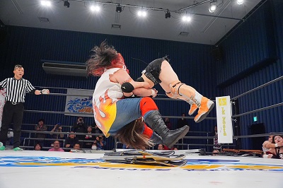 今度はブレーンバスター狙いに行くが、SAKIがカット。しのせがドロップキックからSAKIのアトミックドロップキック。続けてしのせがネックブリーカードロップ。