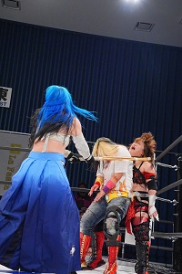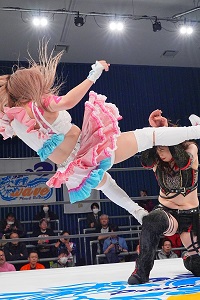 SAKIにタッチ。SAKIがビッグブーツからチョキパンチ。しかし、セーフをアピールしよおうとした瞬間、咲蘭がドロップキックを叩き込んでポーズをさせない。