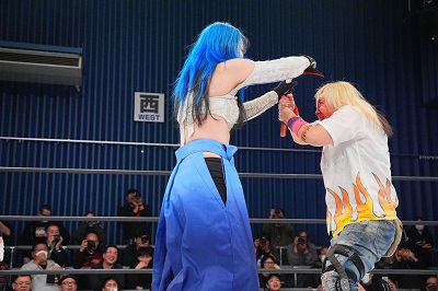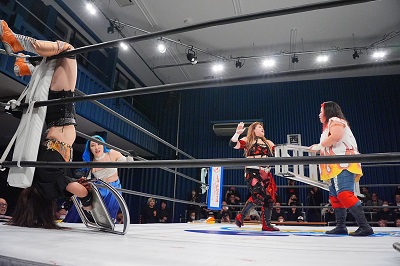 炎華が笹村へ片ヒザをついたまま、反撃のエルボーで殴り掛かる。笹村もエルボーで打ち返す。笹村がイスを振り上げると、炎華がドロップキックで阻止。しかし、タッチに行こうとするが、笹村が足を引っ張っていかせず。それでもメガホンを笹村へ打ち、ついに凶器攻撃で一撃すると、ようやく自軍のコーナーへ。世羅とすずが登場。すずがダブルのスピアーでみぃ、笹村を蹴散らす。