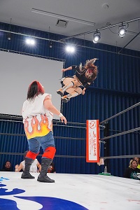 炎華にタッチ。炎華が各コーナーからミサイルキック3連発。4発目を決めようとしたところ、みぃがコーナーに寄り添う。「飛びすぎじゃない? 次飛ぶ前にちょっとお話が。
