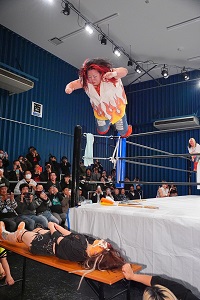 今度は世羅がリング上にラダーを設置。炎華が上り始めると、宮崎が反対から上り始めて阻止に出ようとする。炎華がメガホンで一撃。これを宮崎が奪うと、逆にメガホンで殴打する。世羅が背後から宮崎を抱え上げると投げ捨て式のパワーボム。ここで炎華がラダー上からダイビングボディアタック。2カウント。今度はトップロープへ上る。