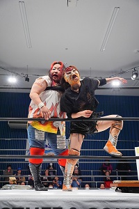 網倉が狐伯を捕らえて、カナディアンバックブリーカーで持ちあげたところに櫻井がビッグブーツの合体技も2カウント。