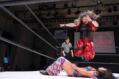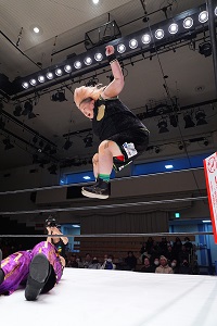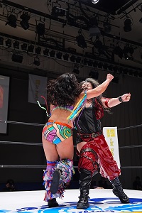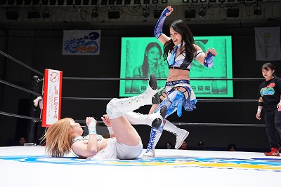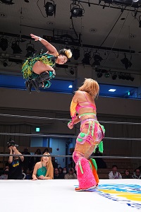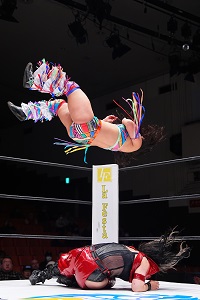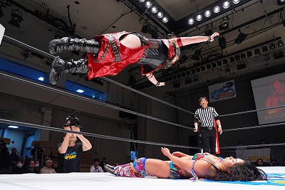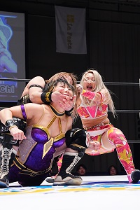 さらに咲蘭を呼び込んでトレイン攻撃。合体式フットスタンプで咲蘭を抱え落とす。2カウント。