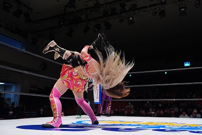 桜花がビッグブーツ、もちが裏拳の打ち合いに。もちが裏拳を連打。突進には桜花がネックハンギングボム。もちがソラリーナで丸め込むが桜花がキックアウト。もちがもっちりバディシザースはカウント2。それでも再度、もっちりバディシザースを決めるとついにカウント3が入った。