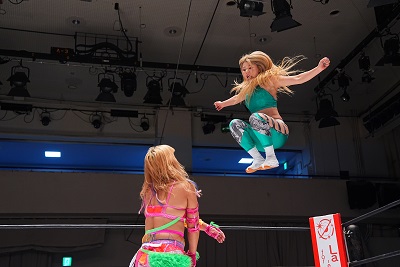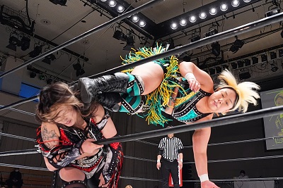 咲蘭がコーナーに上り、くるみへ背後から飛び乗るようにスリーパー。くるみにぶっこ抜きで投げられる。くるみがフットスタンプ。2カウント。