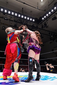 咲蘭がエルボーの反撃。くるみは「どうした、もっと来いよ」と挑発。咲蘭が吠えてエルボーを打ち込む。くるみがコーナーに振ると、咲蘭がブーメランアタックで跳ね返る。くるみがキャッチするも、桜花が咲蘭の背中を蹴ってフォールとなったが、2カウント。