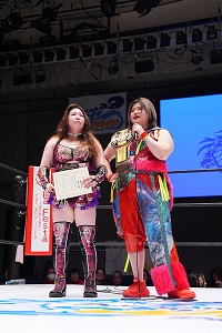 もち「(今日は真面目バージョンだったが)まあ、いろんな顔を出せるのが私の持ち味だと思うので、これからもキラ―モードだったり、元気に戦ったり、いろんな顔を使い分けていずれは頂点であるReginaっていうベルトもあるんで、食い込んでいって、いずれは巻きたいと思います。(次の挑戦者について)負ける気は全くないので、誰が来ても今の私たちは止められないと思います」