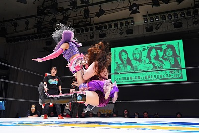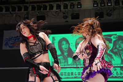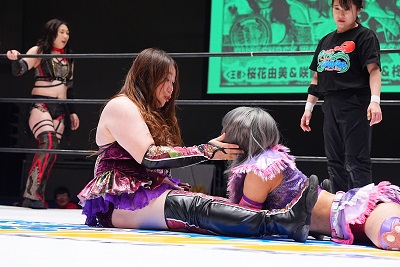 もち&くるみがダブルのバックドロップ。咲蘭のカットから桜花がもちへ投げっぱなしパワーボム。咲蘭がダイビングフットスタンプ。桜花が小鉄ドロップ。カポエラキック。ビッグブーツを狙うも、足を捕らえたもちがドラゴンスクリュー。DDT。