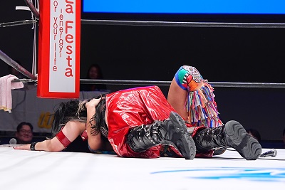 咲蘭がジャパニーズレッグロールクラッチも2。カサドーラで飛びつくが、そのまま尻餅を突かれ、フォールは回避。桜花のカットから咲蘭がコルバタ。ウラカンラナ。連続フットスタンプから連続フォールも2カウント。