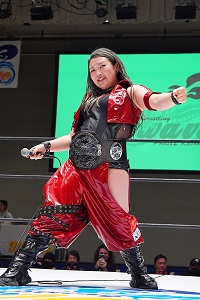 「ベルト取ったぞー! 桜花さんは私のことを真面目じゃないって言ってましたね。真面目にやればもっと強いのにって。今日は真面目に戦いました。私はこのwaveのリングで爪痕を残したいと思っています。このリングに上がる選手は個性が強い。だから、私も個性を最大限に出したつもりでしたが、個性の出し方を間違っていたかもしれない。対角に立って下さってありがとうございました」