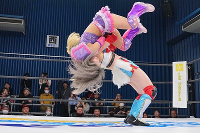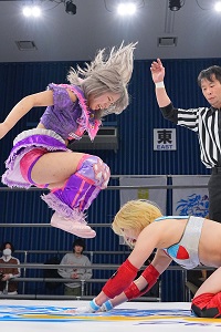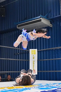 Mariaが梅咲へドロップキック。梅咲がロープにもたれると、ランニング式のカウンターキックで追い込む。ダイビングフットスタンプ。2カウント。