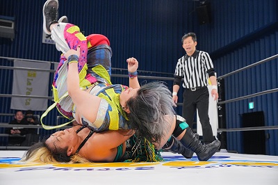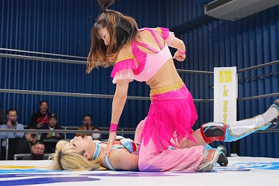 炎華のタイムマシンに乗っては2カウント。ジャパニーズレッグロールクラッチを狙うが、その背後からRIKOが丸め込み、さらにMariaが飛び込んで丸め込むも2カウント。