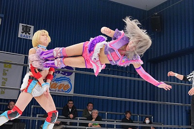 志真うたはアームホイップから低空ドロップキックで反撃。続けて突進するが桜花は体落としで返し、ワキ固めに取る。続いて、串刺し式ビッグブーツを狙うが、志真うたがすかしての逆さ押さえ込み。2カウントで返されると、フライングボディアタックを4連発。そして体格差のある桜花をボディスラムで投げ切る。
