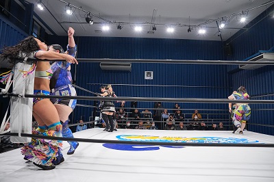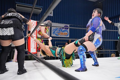 炎華がティヘラで抜け出すと、ロープ二段目からMariaへ飛び乗って回転エビ固め。2カウント。代わった梅咲がドロップキック。飛び出したRIKOともどもダブルのフライングネックブリーカー。RIKOのグーパンチをエルボーで打ち返し、ブレーンバスターで投げる。